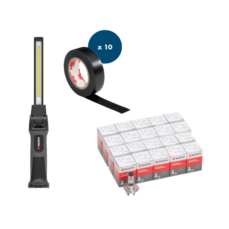 Set vključuje različne komponente za avto razsvetljavo, kot so izolirni trak za popravila, žarnice H7 12V/55W za zanesljivo osvetlitev vozila in kompaktno svetilko.