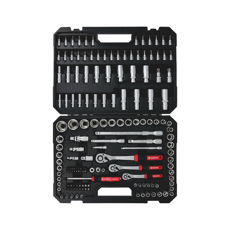 Obsežen komplet iz krom-vanadijevega jekla z nastavki, podaljški in ragljo, zasnovan za širok spekter uporabe pri industrijskem vzdrževanju, gradbenih projektih, avtomobilskih popravilih in montaži.
