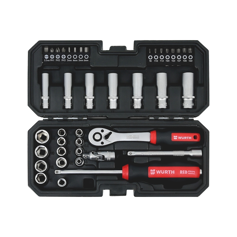 Kompakten komplet iz krom-vanadijevega jekla z nastavki, podaljški in ragljo, primeren za zanesljivo delo pri servisiranju, montaži in splošnih vzdrževalnih opravilih.