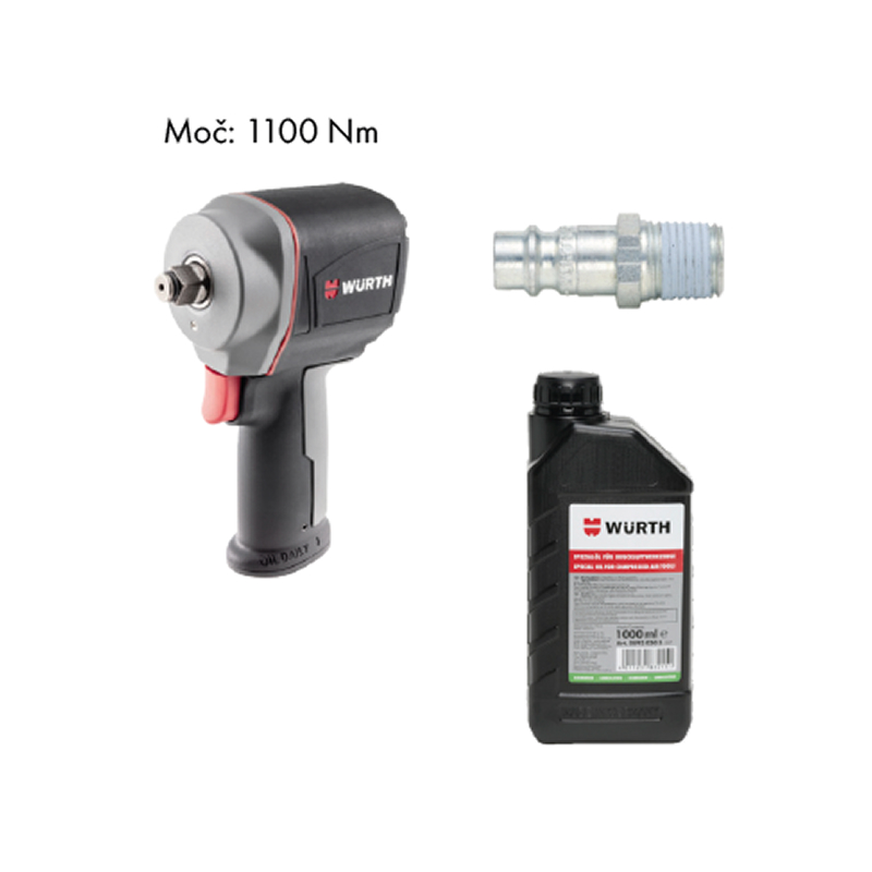 Set vključuje pnevmatski udarni vijačnik 1/2" PREMIUM COMPACT, spojko za pnevmatsko pištolo in posebno olje za vzdrževanje pnevmatskih orodij.