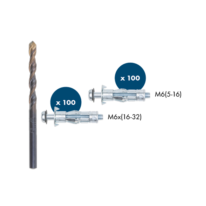 Set je namenjen za montažo v votle stene, kjer so potrebni vložki z vijaki in sveder za natančno obdelavo.