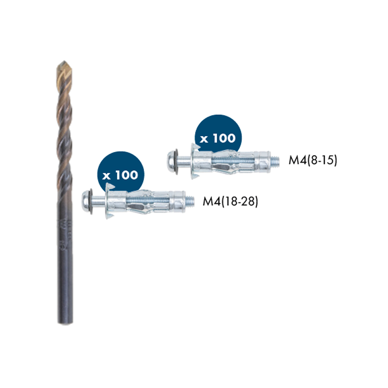 Set je namenjen natančni montaži v votle stene, vsebuje vložke M4 različnih dolžin in večnamenski sveder za pripravo ter varno pritrditev elementov.
