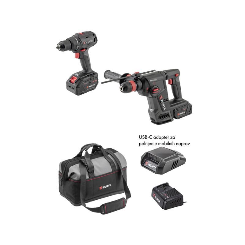 Set je primeren za različne naloge, vključno z vijačenjem, vrtanjem in udarnim vrtanjem, ter vključuje vse potrebno za učinkovito delo v gradbeništvu, montaži in popravilih.