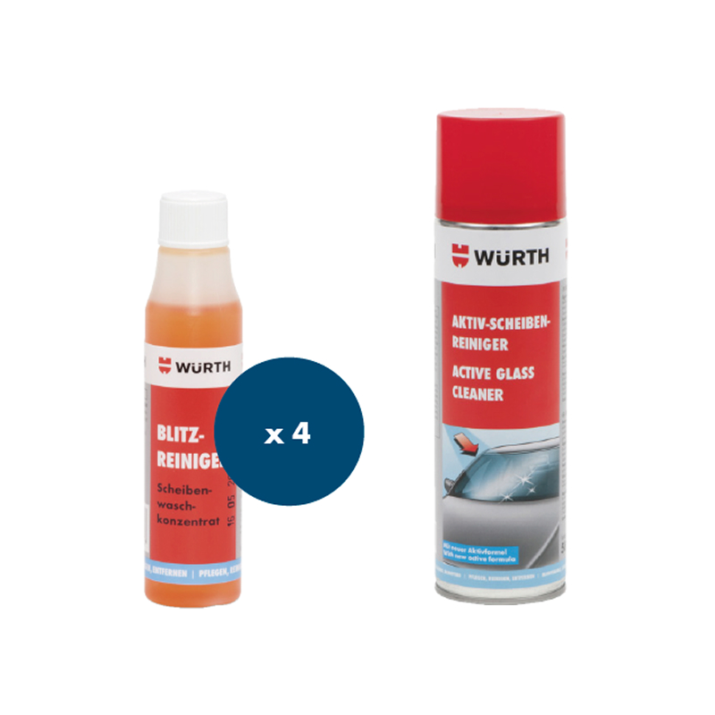 Set vključuje letno čistilo za vetrobransko steklo, ki preprečuje meglenje in učinkovito odstranjuje umazanijo, vključno z ostanki insektov ter čistilno peno za aktivno čiščenje steklenih površin.
