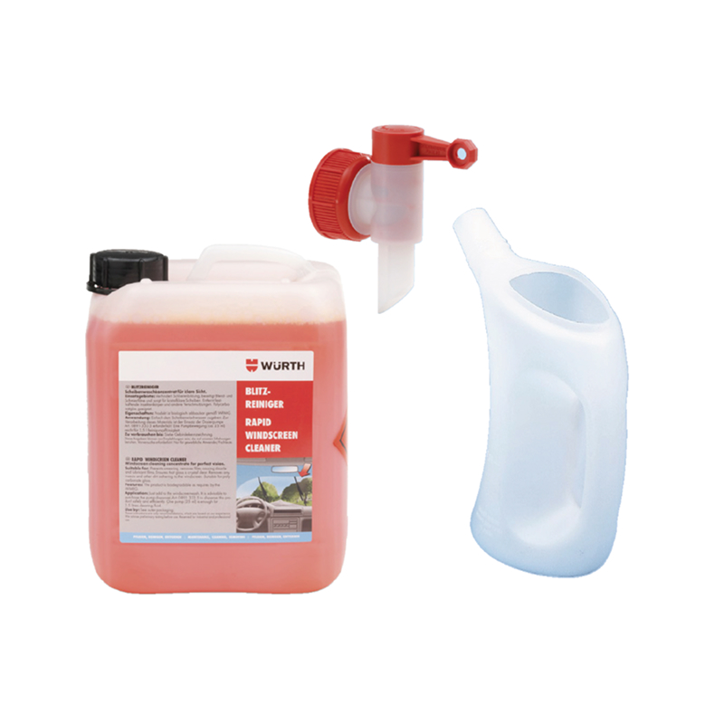 Set vključuje čistilo za vetrobransko steklo, izlivno pipo za tekočine in merilno posodo za natančno doziranje.