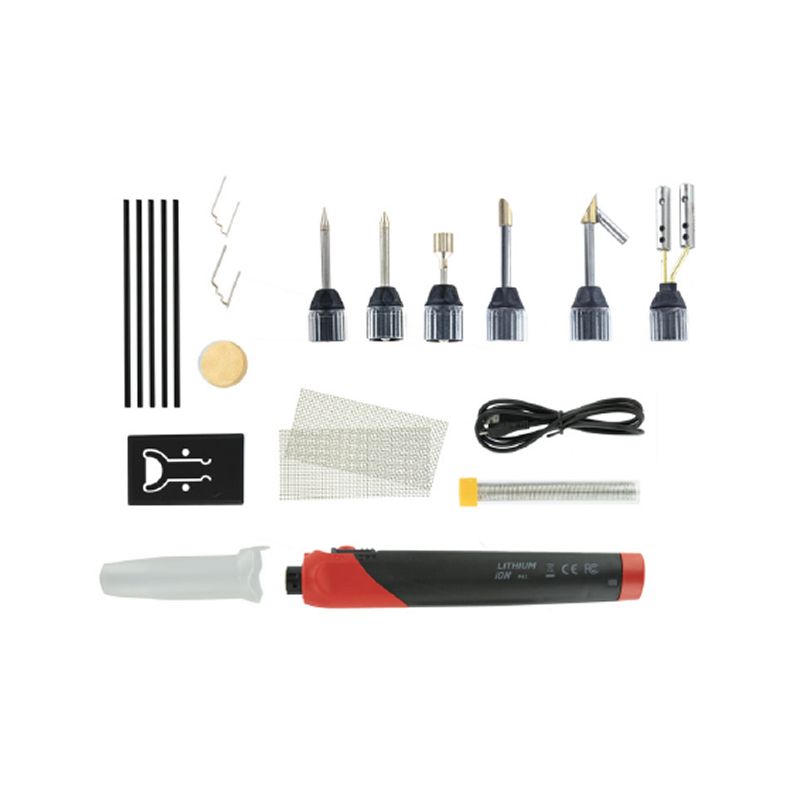 Obsežen komplet za preprosta popravila plastičnih delov in za splošno spajkanje električnih in elektronskih komponent.