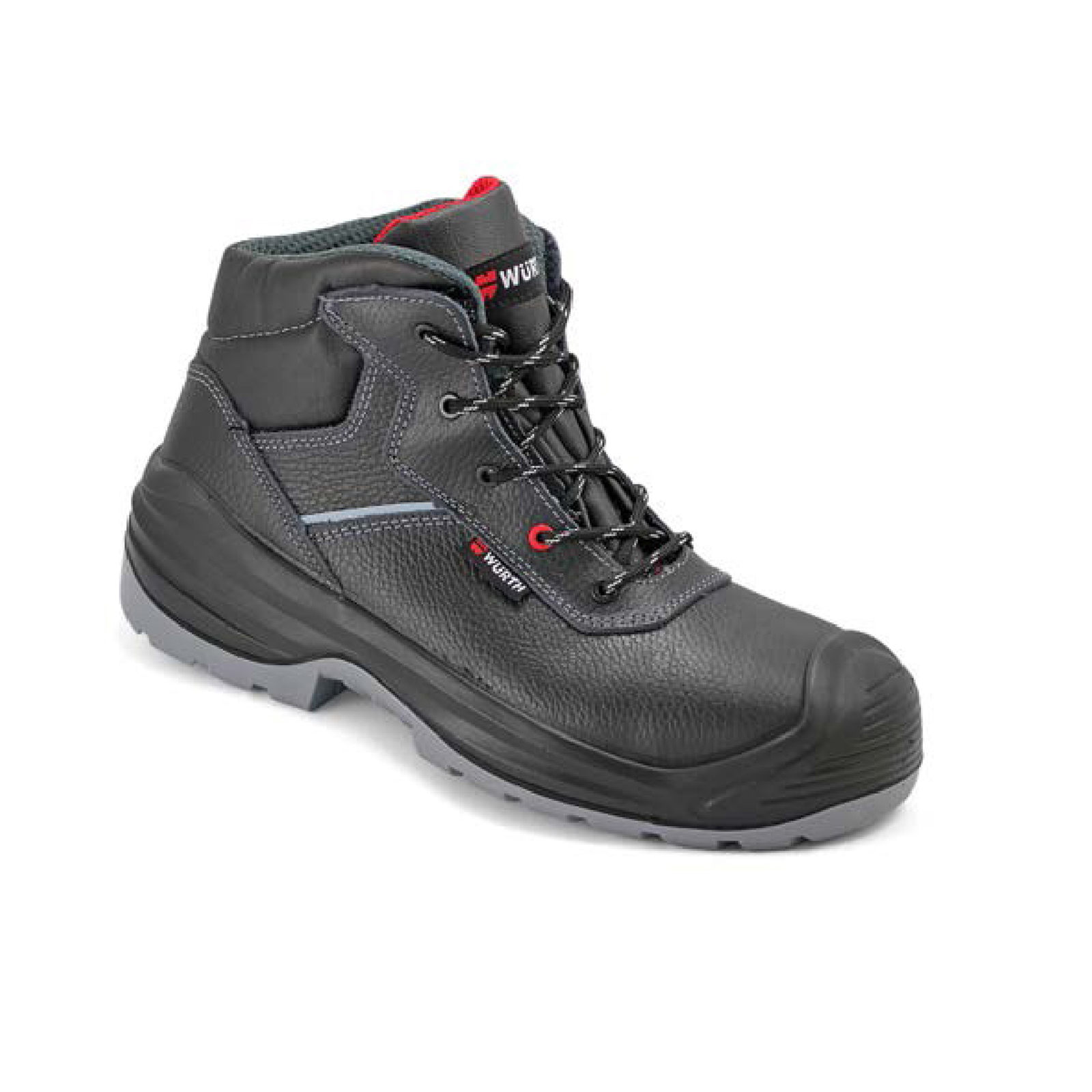 Moderni zaščitni čevelj z zgornjim delom iz vodoodbojnega usnja, kompozitno kapico in neprebojnim podplatom, skladni s standardom O1 SRC.